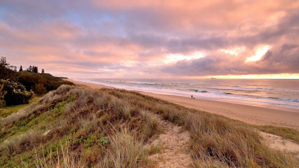 A spectacular section of coastline with a high headland, protected bay, the entrance to Tooway Creek and sweeping views north to Point Cartwright. The beach is not patrolled but is renowned among surfers for its excellent point break. The playground and picnic facilities are very popular and the alfresco dining creates a cosmopolitan atmosphere.